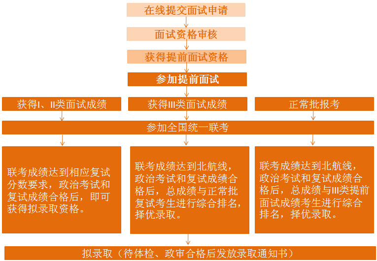 I类面试成绩:获得“国家线或者北航线”条件预录取资格,只要其第一志愿报考北航且联考成绩达到国家A类线或者北航线,政治考试与复试成绩合格,即可直接拟录取;