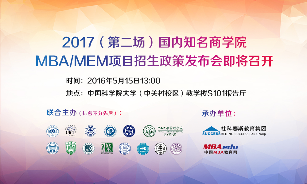 2016年5月15日,北航MBA将参加有社科赛斯教育集团组织的2017(第二场)国内知名商学院MBA/MEM项目招生政策发布会。
