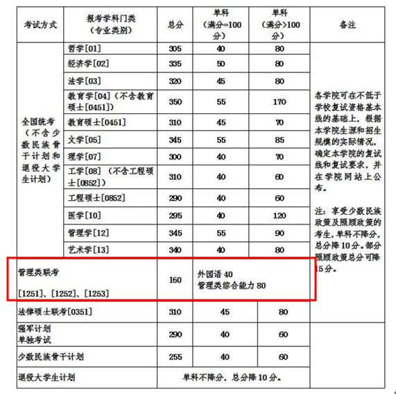 *享受照顾政策考生:参加“大学生志愿服务西部计划”、“三支一扶计划”(支农、支教、支医和扶贫)、“赴外汉语教师志愿者”、“选聘高校毕业生到村任职”、 “农村义务教育阶段学校教师特设岗位计划”项目服务期满的考生,普通高等学校应届毕业生应征入伍服务义务兵役退役后的考生,在三年内参加全国硕士研究生招生考试。其中“选聘高校毕业生到村任职”符合照顾要求的考生,若报考人文社科类专业,复试线可总分降15分。