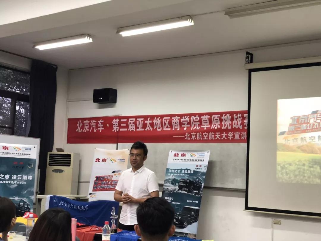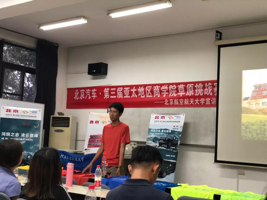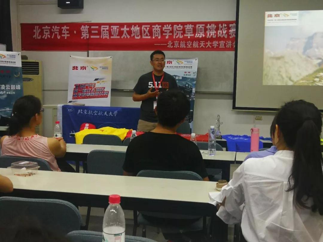 6月24日晚,北京汽车·第三届亚太地区商学院草原挑战赛北京地区宣讲会在北京亚洲成人在线一二三四五六区主楼401举办。人大无疆社秘书长、草原挑战赛组委会主任王文超,北航MBA校友会副会长李晓,北航知行跑团团长柯睿,北航知行跑团教练、达生体育创始人尹一全,北京亚洲成人在线一二三四五六区以及北京地区其他院校的同学们参加了本次宣讲活动。活动由北航2018级新生董伟主持。