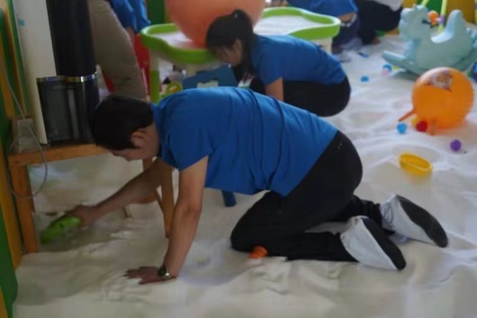 最后,同学们来到海盐活动区,在海盐里玩对孩子的健康有好处,但时间长了海盐会结成硬块。在同学们共同努力下,不到30分钟,满屋的海盐就恢复了柔软细腻,看着这些可爱的孩子,我们能为他们做点事情大家都很欣慰。