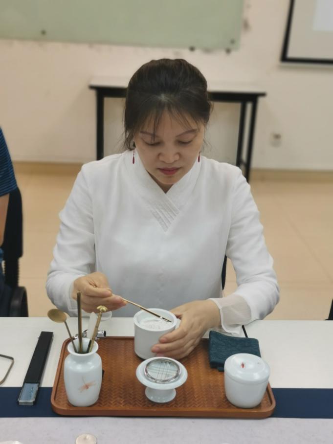 随后,刘老师现场为大家展示了“隔火熏香”的香道表演。在刘老师的手中,一缕醇厚的沉香轻轻散开,大家在萦绕的茶香与空灵的古琴声中,用刘老师所教的品香礼仪,静气凝神,怡然品香。