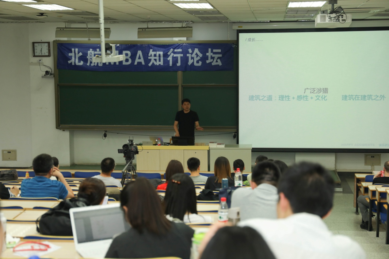 2018年5月12日18点,NEXT建筑事务所(北京公司)合伙人、国家一级注册建筑师、荷兰建筑师协会I-TOP TEAM顾问委员会委员、2008级北航MBA学生蒋晓飞先生做客北航MBA知行论坛,与同学们分享了他的求学和创业经历。通过对自己经历的剖析,引发同学们在利用每个人自身与众不同的天赋、因时而异的机遇去创造属于自己的人生价值方面的思考。蒋先生的演讲主要分成了求学、工作和创业三段经历讲述。