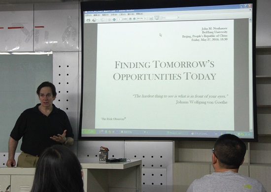 “John 在对冲基金领域有着十几年的经验,他所提出的逆向交易理论也颇受业界推崇;他是Chalfont Hill Capital的创始人,同时也是美国《风险观察员》(the Risk Observer)的总编辑。”当主持人韩立岩教授介绍话音一落,A618教室立刻响起热烈的掌声。