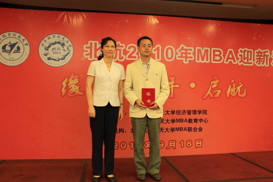 北航经济管理学院副院长杨梅英教授为MBA新生奖学金一等奖获得者侯在克同学颁奖并合影