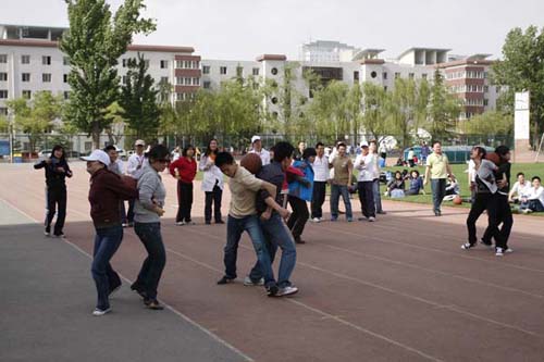 其次是小组赛阶段,包括吞吃蛇、背球接力赛和二人三足三个娱乐项目。100多位参赛同学按照抽签原则被分为10个小组,每位同学都有机会和其他班级的同学以及普研的同学有一次亲密接触的机会。小组成员聚在一起,抛开了课堂上的沉闷与刻板,讨论着怎样才能更好的完成任务,在比赛中获胜,还认真的练习着。在吞吃蛇这个游戏中,组员们紧紧地手牵着手,组成长长的队伍,在赛道上奔跑着,此刻大家就是一个紧密的集体,只有良好的团队协作才能顺利完成这个游戏。