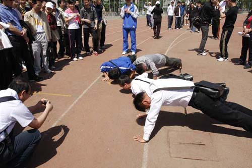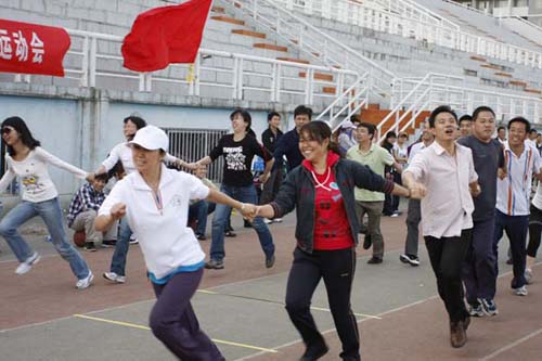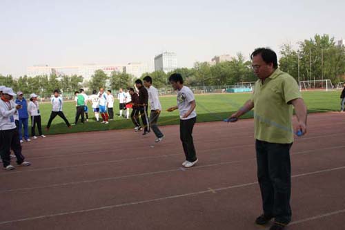 运动会分为三大环节,首先是以班级为单位的团队争霸赛,包括拔河比赛、投沙包和跳绳三个比赛项目。场上的比赛气氛十分热烈,尤其是在拔河比赛中,参赛同学纷纷使出浑身解数,为班级争光;而场下同学作为拉拉队也毫不示弱,为赛场上的同学呐喊助威,“一二加油”的声音和获胜时的欢呼声一时响彻云霄。最后09级MBA三班赢得了团体第一。