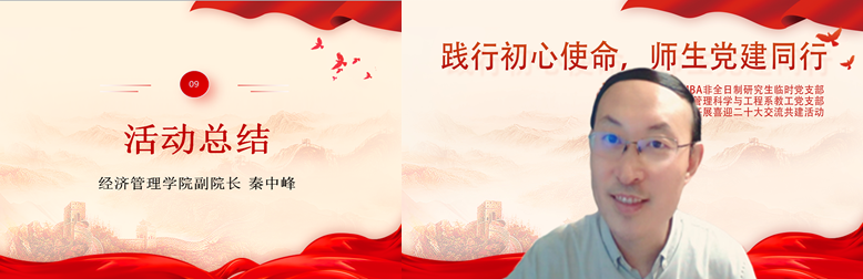 学院副院长秦中峰在总结讲话中提到,坚持党建引领一直是学院和MBA教育的特色之一。本次师生共建活动是对学院党建工作优良传统的传承,也是密切师生关系、提高党性修养、喜迎二十大胜利召开的实际行动。全体MBA学生党员要传承红色基因,践行使命担当,努力成为堪当民族复兴重任的时代新人!