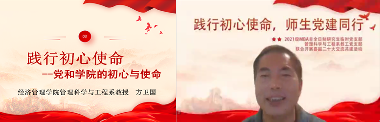 管理科学与工程系教工党支部党员代表方卫国教授,为大家带来题目为《践行初心使命——党和学院的初心与使命》党课分享。方卫国老师讲述了“不忘初心”在我党不同发展阶段的表述,回顾了北航及经济管理学院的筹建和发展历程。