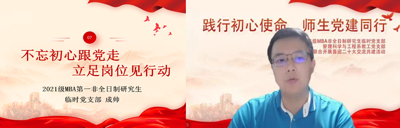 MBA学生党员成帅带来《不忘初心跟党走 立足岗位见行动》实践分享。成帅同学作为ZF21082班班长,用热情和真心为同学做好各项服务,做好班级和学院、MBA教育中心的桥梁。