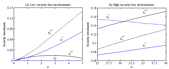 通过分析社会福利最大化下的安全投入水平发现,如果云服务产品与本地软件面临同样的安全攻击水平,在低安全损失环境下,云服务的社会最优安全投入水平要高于本地软件产品,但是在高安全损失环境下,结论相反(如图2所示)。