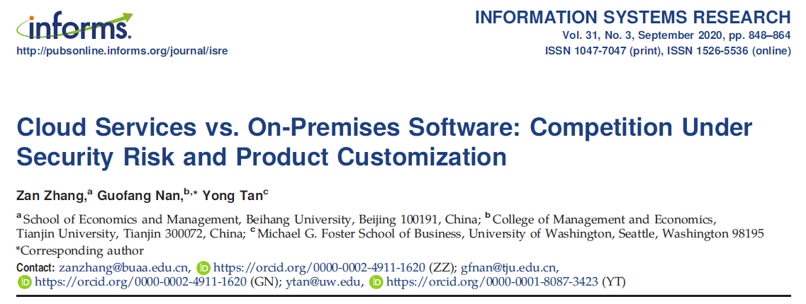 2020年9月,信息系统顶级期刊《Information Systems Research》刊发了我校经管学院卓百博后张赞在云计算服务安全方面的最新研究成果“Cloud Services vs. On-Premises Software: Competition Under Security Risk and Product Customization”。我校张赞为第一作者,合作者包括天津大学南国芳教授和美国华盛顿大学TanYong教授。