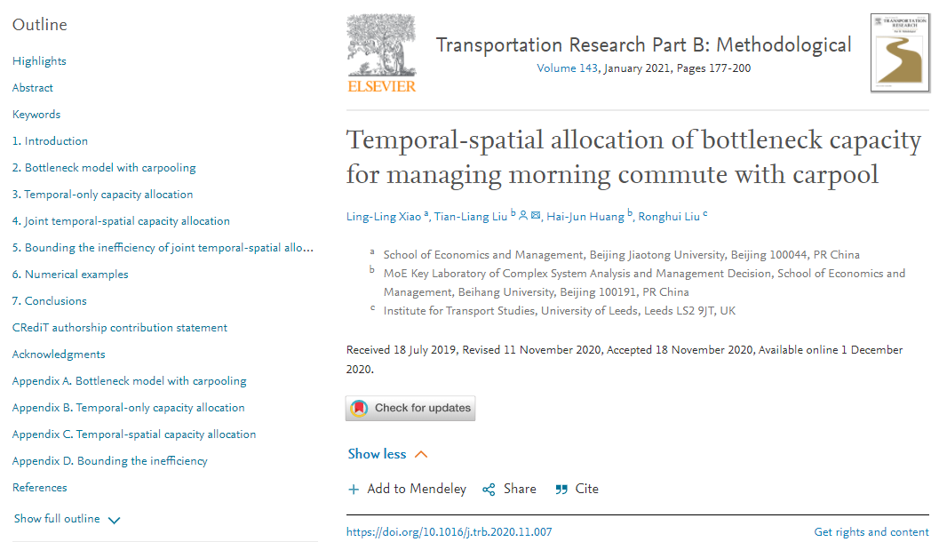 2020年12月1日,《Transportation Research Part B: Methodological》在线发表了我校经管学院教师关于拼车专用车道容量时空分配的最新研究成果“Temporal-spatial allocation of bottleneck capacity for managing morning commute with carpool”。我校刘天亮教授为论文的唯一通讯作者,合作者包括北京交通大学肖玲玲副教授(第一作者)、我校黄海军教授和英国利兹大学刘蓉晖教授。