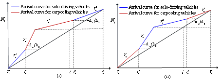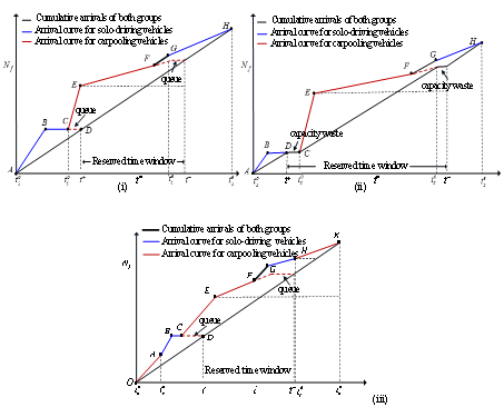 考虑拼车成本分量的不同取值组合,研究团队解析出了引入拼车专用车道前的三种典型的早高峰动态通勤均衡态,即:拼车者在高峰时段的中心通过瓶颈,自驾者在首尾两端通勤(图1(i));自驾者在高峰时段的中心通过瓶颈,拼车者在首尾两端通勤(图1(ii));所有人自驾通勤。